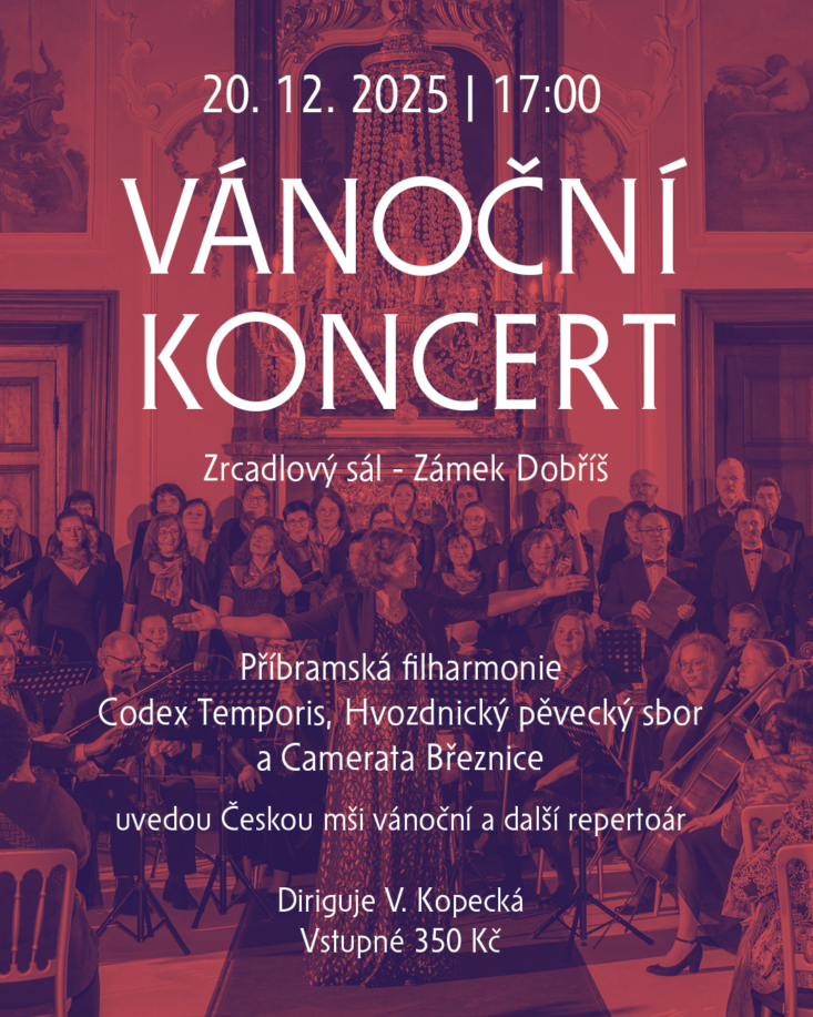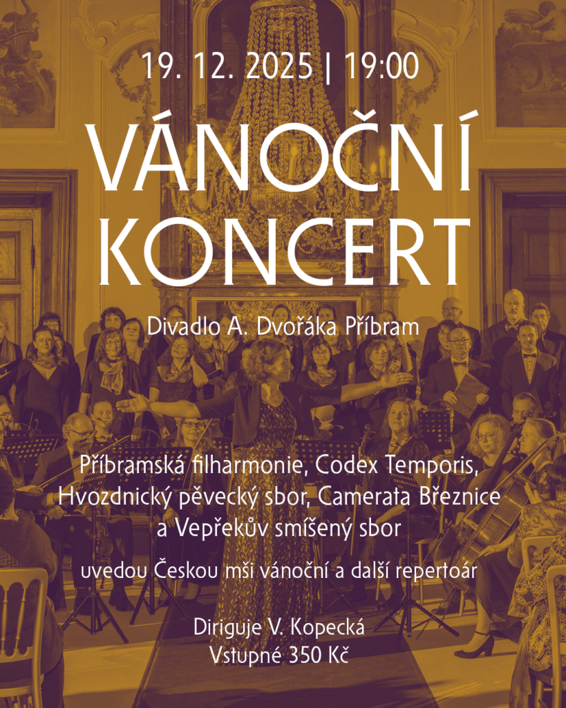 Srdečně vás zveme na tradiční vánoční koncert Příbramské filharmonie, kde vystoupíme spolu s příbramským Vepřekovým smíšeným sborem, dále pak Hvozdnickým pěveckým sborem a Smíšeným pěveckým sborem Camerata Březnice. Sólově vystoupí Kateřina Falcníková, Dagmar Drechslerová, Jaroslav Novák a Petr Sejpal. Tradiční vánoční mši J. J. Ryby „Hej, mistře!“ a další vánoční melodie zazní pod taktovkou dirigentky Veroniky Kopecké. Přijďte se s námi vánočně naladit.